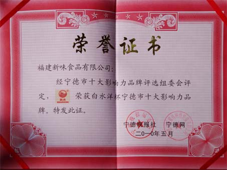 熱烈祝賀“新味”品牌被評為“寧德十大影響力品牌”榮譽稱號,“白水洋”杯“寧德十大影響力品牌”經(jīng)過網(wǎng)絡(luò)投票、專家評比,品牌美譽度調(diào)查,品牌影響力調(diào)查等層層篩選:“新味”品牌因其產(chǎn)品獨特,帶動面廣,影響力大而名列其中。